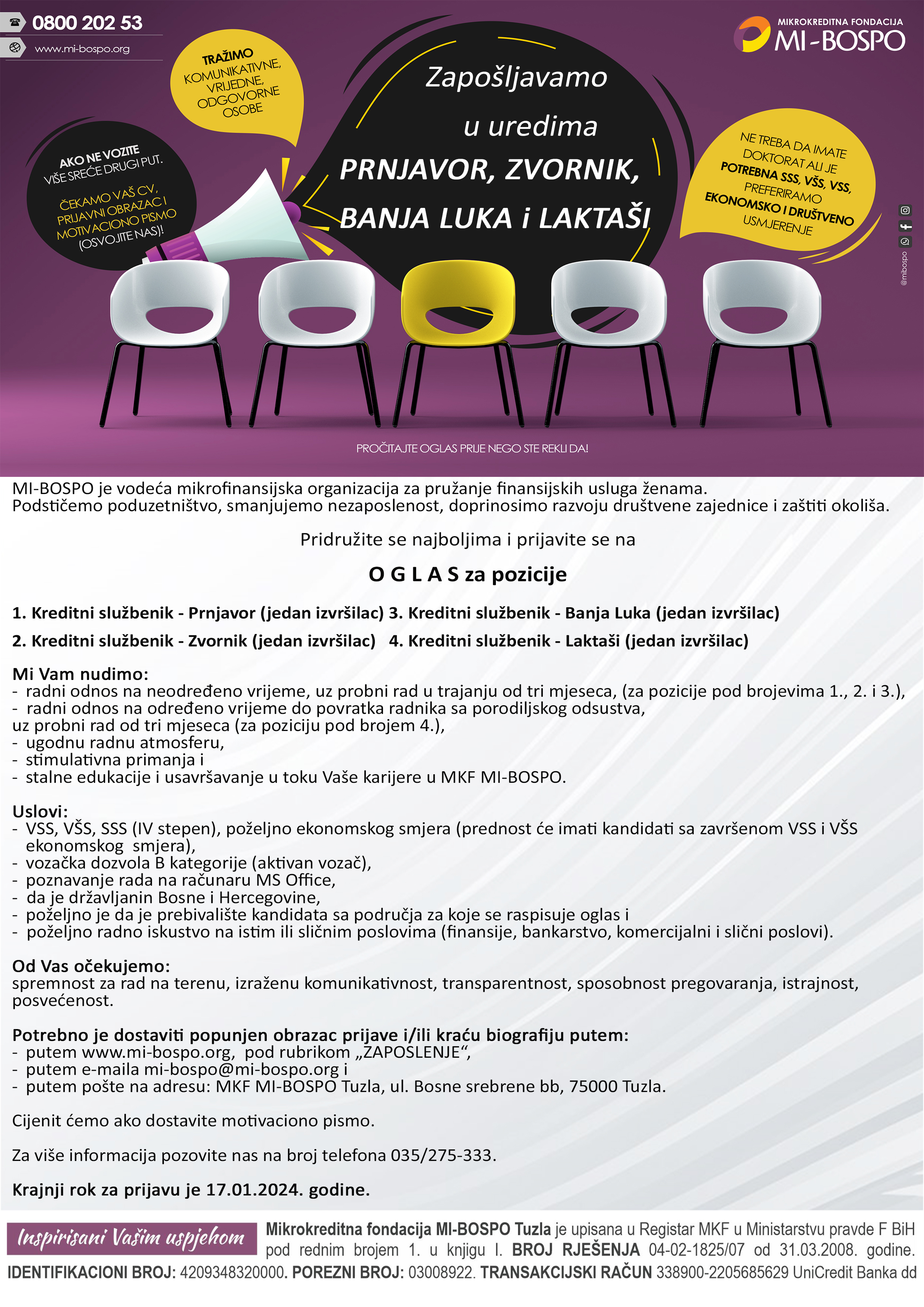 „MI-BOSPRO“ микрофинансијска организација за пружање финансијских услуга женама, расписује конкурс за сљедеће позиције: