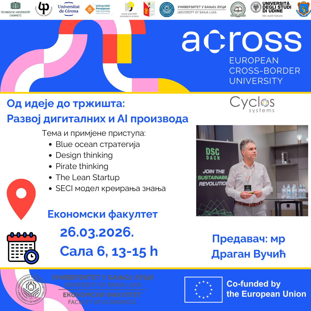 The University of Banja Luka (UNIBL), a partner in the Across alliance of ten European universities supported by the EU (https://www.across-alliance.eu/), is organizing a career development support activity for UNIBL students as part of Work Package T1.3 Cross-border Careers for Students and Staff. This will take the form of a two-hour workshop titled “From Idea to Market: Development of Digital and AI Products.”