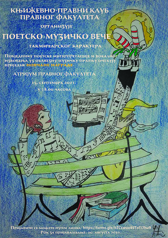 Књижевно-правни клуб Правног факултета организује културно-умјетнички догађај такмичарског карактера под називом „Поетско-музичко вече“ с циљем промовисања лијепе ријечи и вокално-музичке даровитости студената Универзитета у Бањој Луци. За најуспјешније извођаче и интерпретаторе обезбиједили смо вриједне новчане награде. Позивницу можете преузети овде. Рок за пријаву 20.8.2021. године.