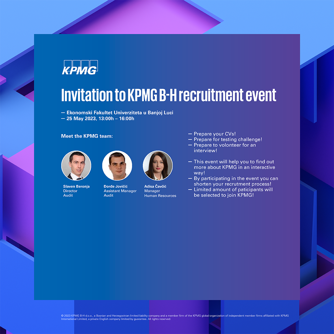Позивамо заинтересоване студенте Економског факултета Универзитета у Бањој Луци на презентацију о личним искуствима у раду у KPMG-у, једном од најбоље оцјењених послодаваца у свијету за студенте пословних студија, те о опцијама студентских пракси и могућности запослења које ова компанија нуди. KPMG пружа услуге из области ревизије, пореза и пословног савјетовања. Током презентације која ће се одржати у четвртак, 25.05.2023. године, са почетком у 13.00 часова, у сали са рачунарима бр. 301, студенти ће имати прилику да учествују у симулацији интервуја за рад у KPMG-у те вредновању властитих способности кроз тестове из различитих области.