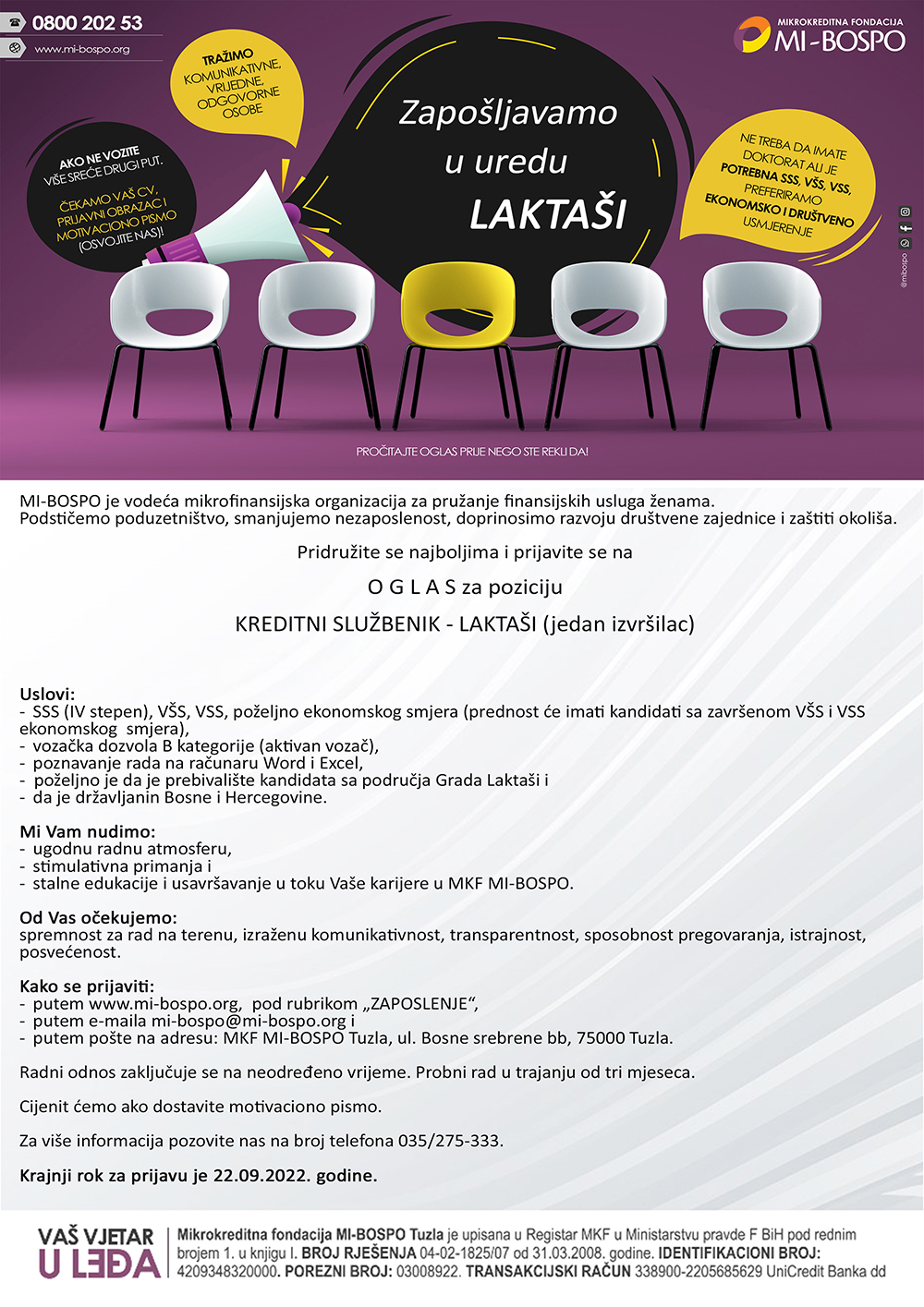 МИ-БОСПО микрофинансијска организација позива све заинтересоване да се пријаве за позицију Кредитни службеник - Лакташи.